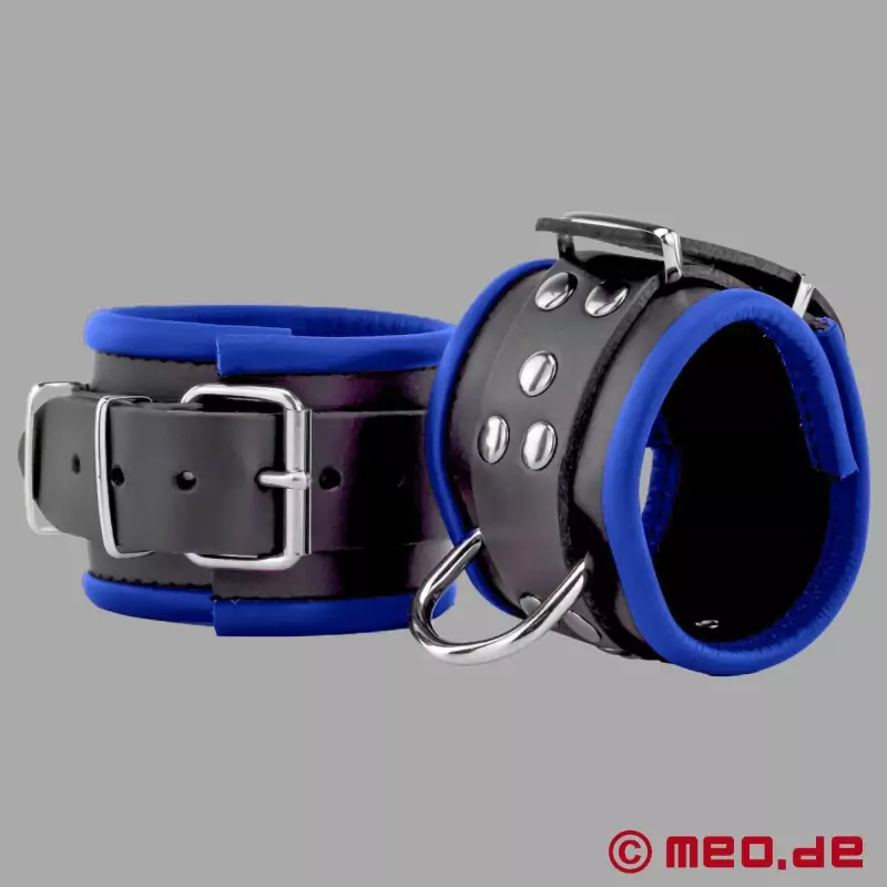 Die blau/schwarzen Fußfesseln von MEO sind sehr stabil, lassen sich gut schnüren und halten dann auch sehr gut kräftiger Gegenwehr stand.