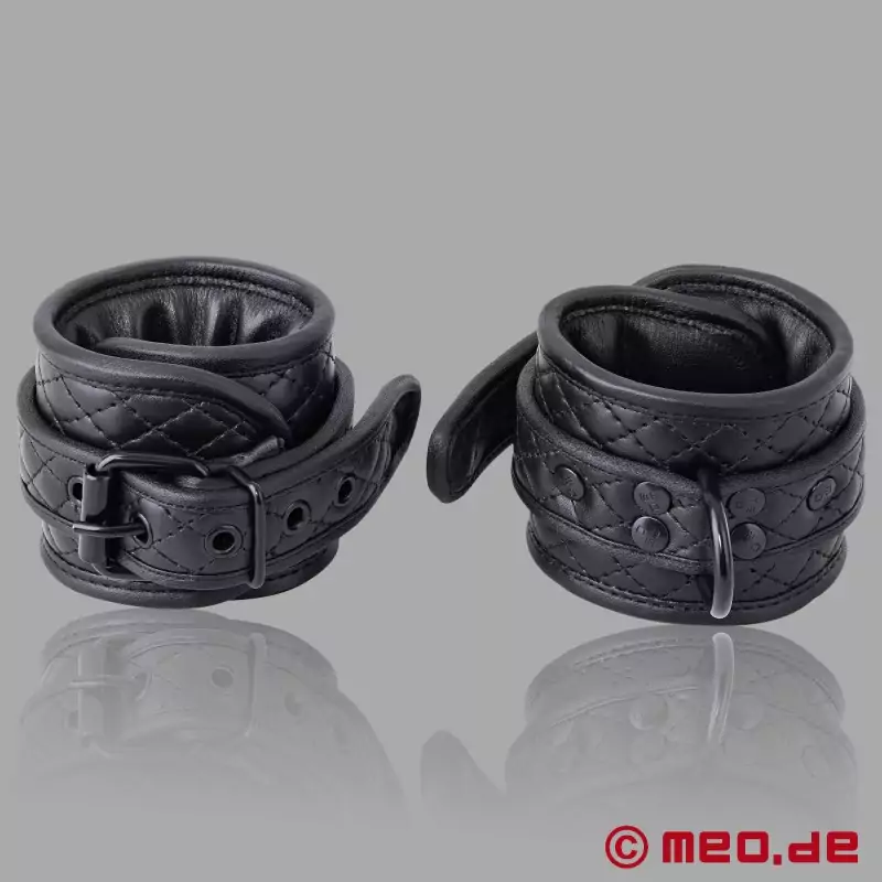 Luxo, conforto e profissionalismo combinados num par de algemas de tornozelo: As algemas de tornozelo Black Diamond da MEO® aninham-se ergonomicamente contra os tornozelos graças ao couro de vaca suavemente acolchoado e podem ser ajustadas com precisão tanto para tornozelos estreitos como para tornozelos fortes. O acolchoado de diamantes caraterístico estabiliza o acolchoamento das algemas de tornozelo, enquanto as tachas e fivelas revestidas a preto completam o elegante visual preto sobre preto. Graças ao trabalho cuidadoso, ao couro de alta qualidade e aos detalhes bem pensados, o bondage com as nossas luxuosas algemas de tornozelo não só é mais divertido, como também te sentes melhor e mais seguro.