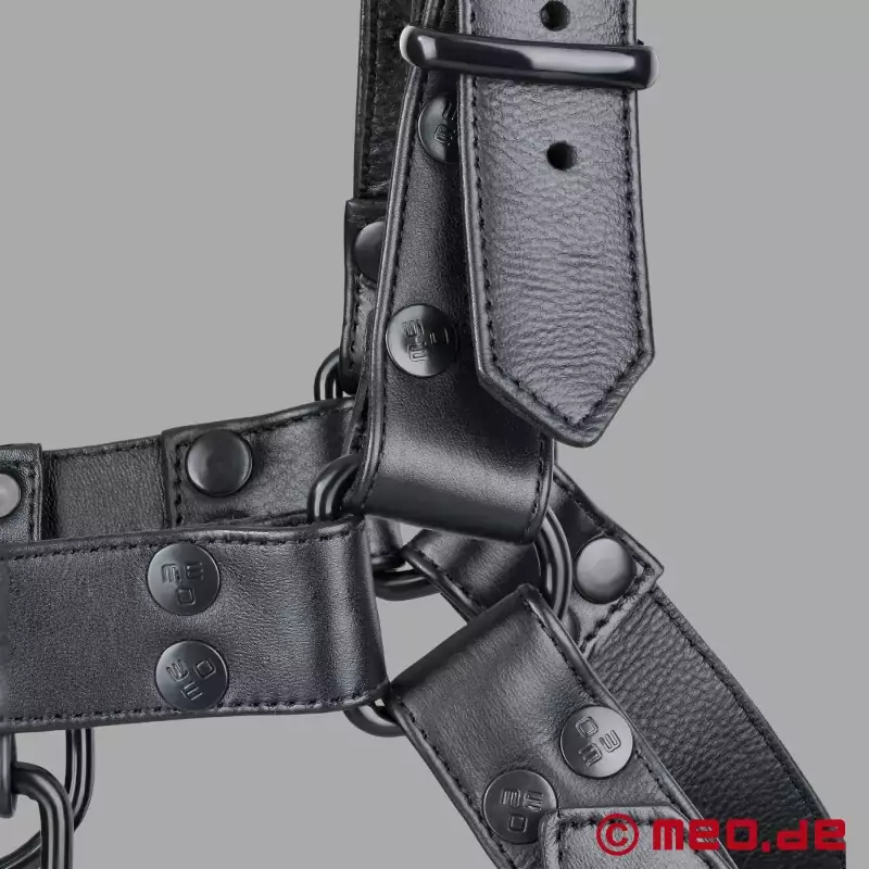 Este arnês de couro preto/preto da MEO® é a primeira escolha para quem quer mostrar as suas preferências sexuais de forma visível e confiante. O arnês FetishGear™ em preto/preto faz uma declaração clara com os seus detalhes pretos - masculino, intransigente e feito para performances fortes.