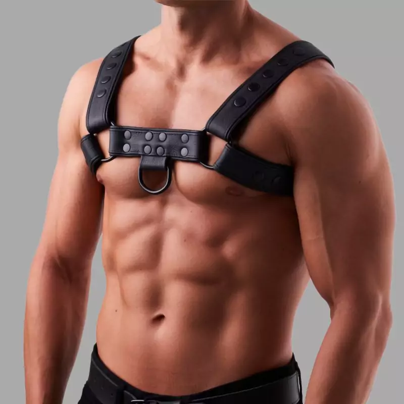 Este impressionante arnês é composto por uma construção de quatro camadas de couro macio. Combinado com grandes argolas pretas, botões de pressão, rebites de dupla face e um acabamento de alta qualidade absoluta, é o derradeiro must-have que nunca mais vais tirar.