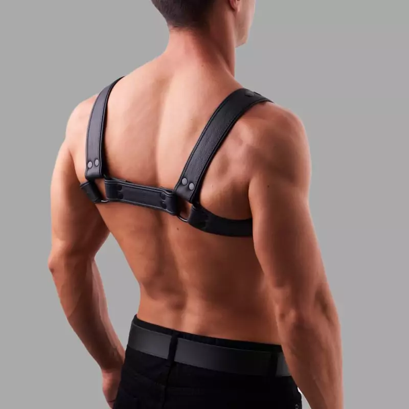 Este impressionante arnês é composto por uma construção de quatro camadas em couro macio. Combinado com grandes argolas pretas, botões de pressão, rebites de dupla face e um acabamento de alta qualidade absoluta, é o derradeiro must-have que nunca mais vais tirar.