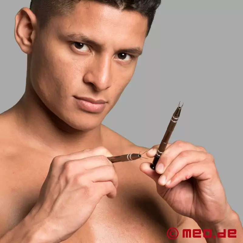 Para muitos amantes de BDSM, ver o olhar de prazer e dor no rosto do seu parceiro submisso é um momento profundamente excitante - e é exatamente por isso que os grampos e pinças são parte integrante das sessões intensas de BDSM. O GripTease™ do Dr. Sado, um brinquedo sexual BDSM profissional, proporciona a estimulação mais intensa dos mamilos e é um dos favoritos nos estúdios de BDSM. Os amantes de jogos intensos de mamas ou de tortura de mamas em particular ficarão encantados com esta ferramenta. Basta pressionares o pino integrado do GripTease™ e as garras dolorosas feitas de aço mola de alta qualidade estendem-se. Uma vez colocadas no mamilo e libertadas, as garras agarram-se firmemente e proporcionam uma experiência inesquecivelmente intensa!