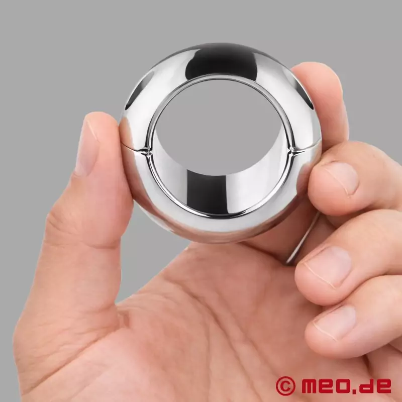 Trata-se de um esticador de testículos de duas partes em aço inoxidável maciço, cujos dois elementos estão fechados e firmemente ligados com parafusos sextavados. O nosso esticador de testículos é bulboso no exterior e cilíndrico no interior. Isto dá-lhes a forma de um verdadeiro Donut. Por um lado, isto tem a vantagem de conseguir o maior peso possível utilizando o mínimo de material possível e, por outro lado, dá ao esticador de testículos uma forma visualmente apelativa.
