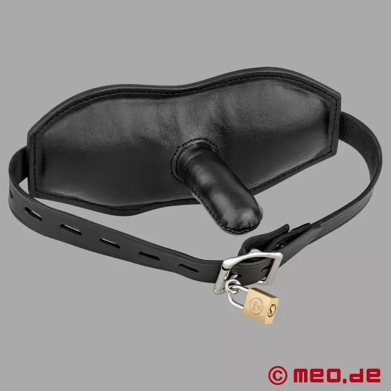 A nossa mordaça pode ser fechada de forma segura e "decorativa" na parte da frente. A mordaça está equipada com uma correia de couro larga; um grande número de orifícios na correia torna-a ajustável em tamanho e garante um ajuste confortável. Atrás da máscara bucal esconde-se uma mordaça de couro. Claro que a mordaça também pode ser usada sem o fecho de tempo, ou o fecho de tempo também pode ser substituído por um cadeado normal.