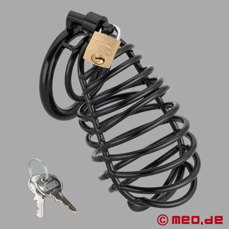 Um cinto de castidade eficaz para homens, porque o design totalmente metálico e à prova de rutura da MEO não deixa nada a desejar no que diz respeito a manter a castidade do homem submisso. Cada modelo individual de NoPacha® adapta-se perfeitamente aos órgãos genitais masculinos e a sua construção sólida em aço de alta resistência garante a castidade do homem. O dispositivo de castidade com dobradiças e completamente bloqueável é feito de uma liga de aço de alta resistência e as superfícies também são revestidas de preto. Isto não só cria um aspeto particularmente atraente, mas também uma superfície resistente à maioria dos líquidos.