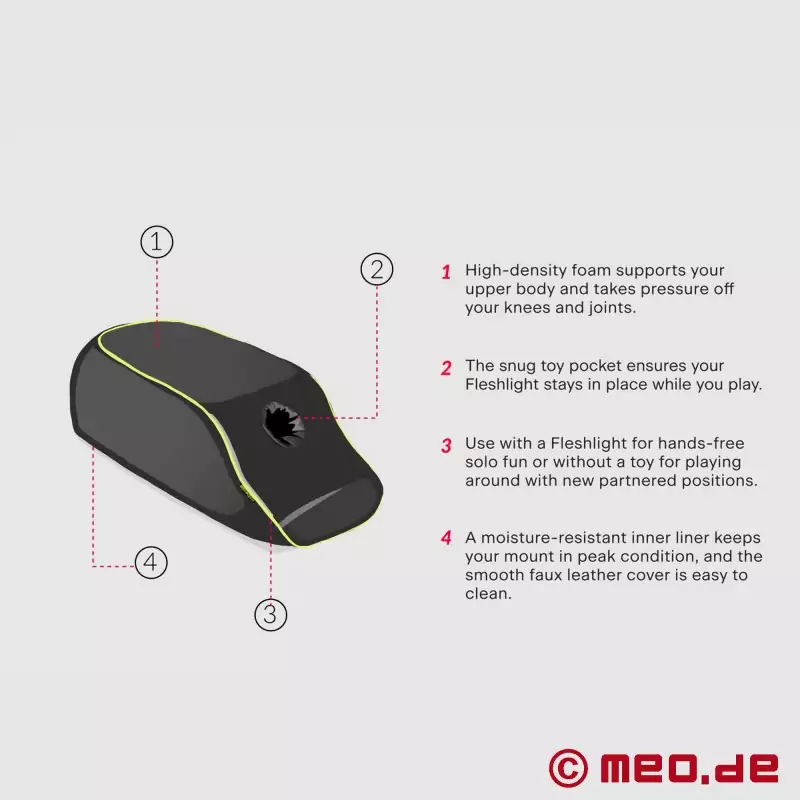 Para um sexo a solo sem mãos que parece sexo a sério. A "Fleshlight on a Mission" da Liberator® é um acessório ergonómico com um suporte especial para masturbadores das séries Fleshlight® e Fleshjack. O masturbador é fixado com segurança no encaixe e posicionado no ângulo perfeito. Isto permite uma penetração profunda e poderosa, proporcionando sensações realistas, orgasmos mais intensos e uma experiência que se aproxima incrivelmente do sexo real.