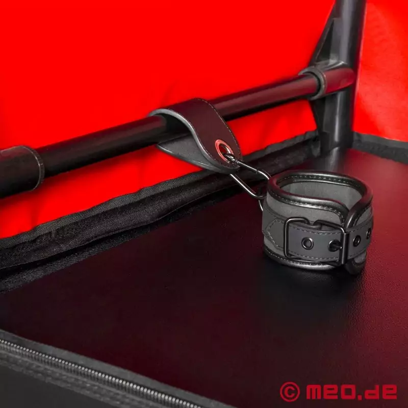 O robusto sistema tubular de encaixe com lona robusta e opaca pode ser montado numa "gaiola de prazer" num instante. Duas generosas aberturas laterais e uma abertura para a cabeça com um colar de pescoço ajustável proporcionam o acesso desejado - tanto no interior como no exterior. Um tapete macio e uma pelle garantem o conforto, enquanto as algemas almofadadas fornecidas fixam o Sub no lugar - pronto para qualquer fantasia.