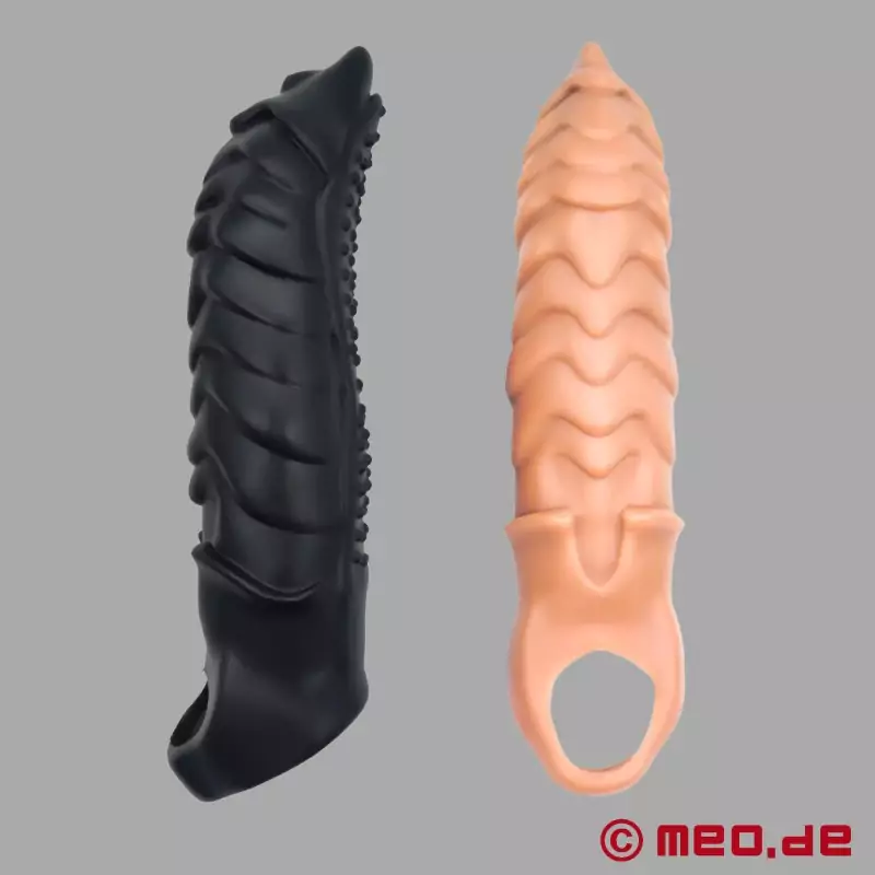 A manga de silicone elástica adapta-se perfeitamente a qualquer pénis, aumentando-o visivelmente e criando um aspeto impressionante e monstruoso. A estrutura distinta da superfície com ranhuras, saliências e lamelas proporciona uma estimulação intensa em cada impulsos no ânus ou na vagina. O interior da manga do pénis é macio e flexível para o máximo conforto, enquanto o exterior é dominante, selvagem e intransigente.