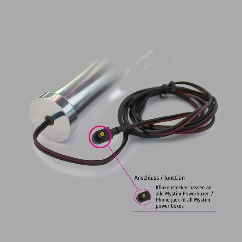 O consolador de alumínio liso pode ser inserido fácil e profundamente. A maneira mais fácil é usares um lubrificante como o ESHOCK. O dildo vai literalmente eletrificar-te porque, dependendo da definição, sentirás um formigueiro suave, pulsos rítmicos ou impulsos sensuais. Não há nenhum truque de magia por detrás disto, é física. O pólo positivo e o pólo negativo estão separados por alguns centímetros. Para ativar os dois pólos, precisas de um aparelho de corrente de estimulação.
