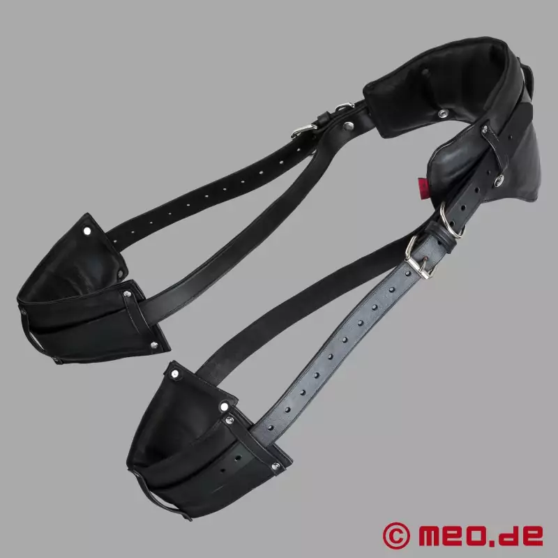 Gut gepolsterte Kissen aus weichem Leder umschließen den Nacken und die Kniekehlen und ermöglichen so ein besonders tiefes Eindringen beim Sex. Mit zwei Schnallen lässt sich der Sling individuell einstellen. Zwei D-Ringe aus Stahl an den Seiten ermöglichen sogar das Anbringen von Handfesseln.