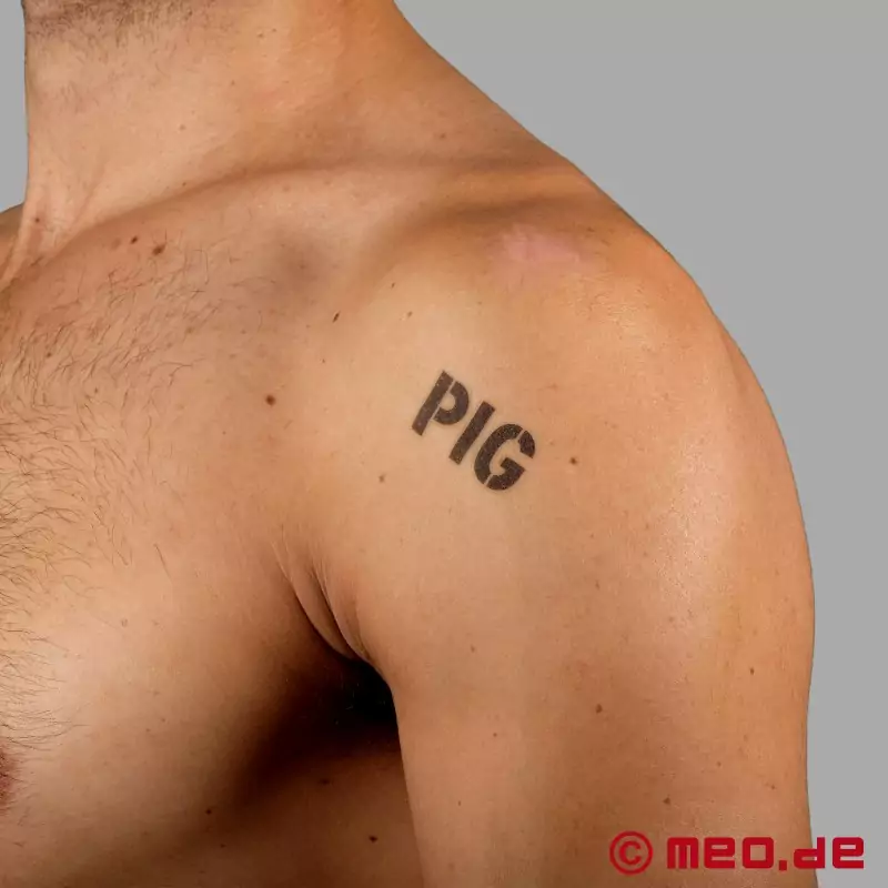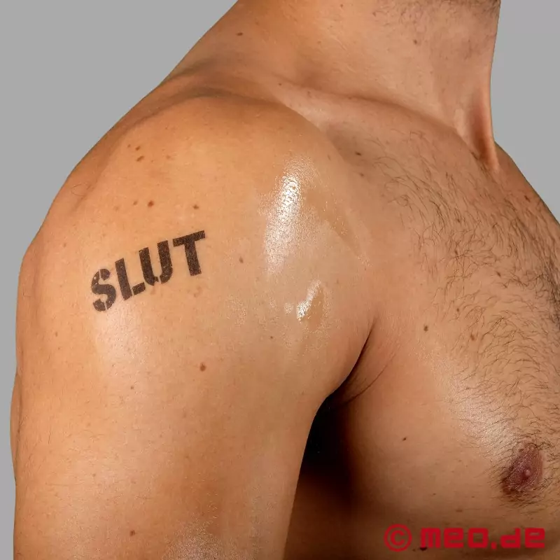 Indolores, temporárias e extremamente realistas: as nossas tatuagens profissionais (SLAVE, PIG, BITCH, etc.) garantem efeitos de transformação sensacionais na tua próxima sessão BDSM, festa fetiche, clube, durante o sexo ou apenas por diversão.