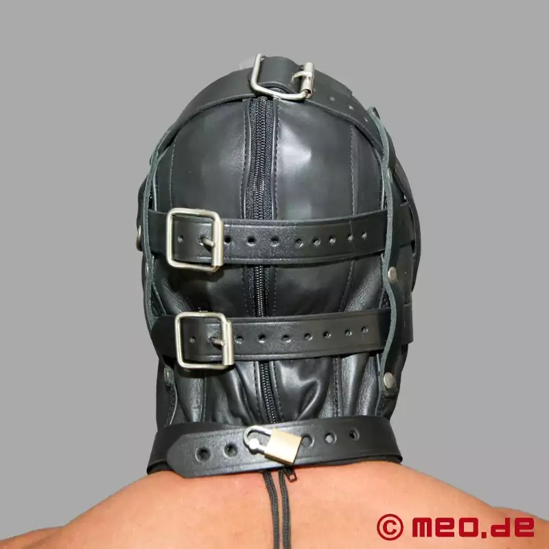 К кожаной маске прочно прикреплен закрывающийся шейный ремешок. Наша кожаная маска имеет как надежно застегивающуюся шнуровку (с защитой для волос), так и прочную молнию сзади. Фиксируемый шейный ремешок и 3 ремешка для головы обеспечивают надежную посадку.