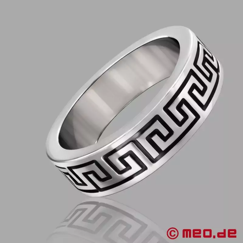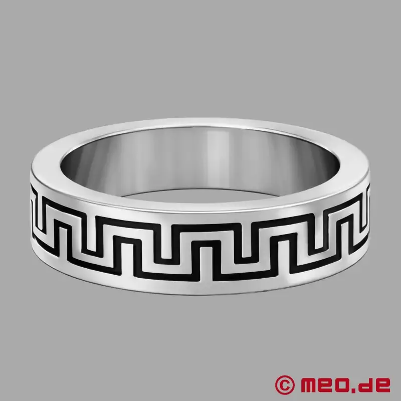 Узор "Ла Грека" - один из самых известных орнаментов Древней Греции, который и сегодня можно встретить в архитектуре, искусстве и дизайне. Его характеризует перекрещивающаяся прямоугольная полоса линий - мощная, геометричная и неподвластная времени. Cock Ring серебристого цвета с черной вставкой выглядит особенно чисто, контрастно и роскошно.