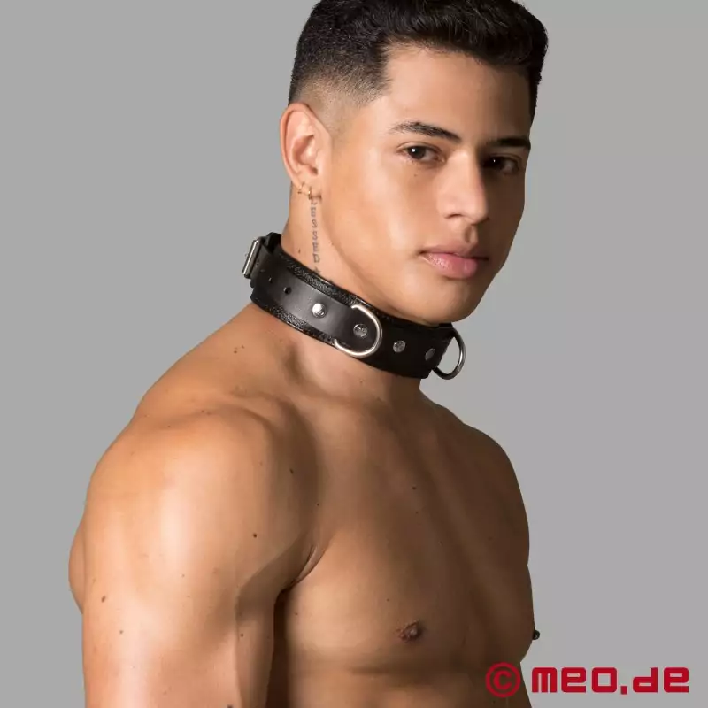 Ошейник изготовлен из мягкой, подбитой кожи и разработан так, чтобы его было удобно носить. Многочисленные швы помогают сохранять его форму, а мягкая поверхность обеспечивает удобную посадку. Металлические кольца обеспечивают четкий, доминирующий акцент и дают возможность прикрепить совместимые бондажные аксессуары (например, поводок, стальные цепи или бондажную веревку).