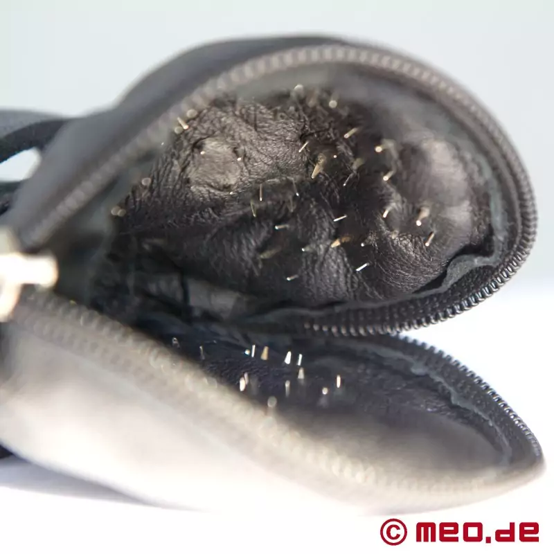 This devious chastity device imprisons the penis and torments it with pin pricks. It consists of a black leather pouch, held in place by a lined elastic band and a thin, leather cock strap that takes a small lock. The inside lining of the device contains few hundred little spikes. It will prick and scratch the skin like little thorns, but will not pierce the skin unless you squeeze or slap it very firmly... or the penis enlarges in the device and presses up against the lining.