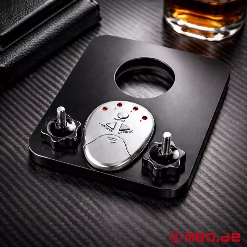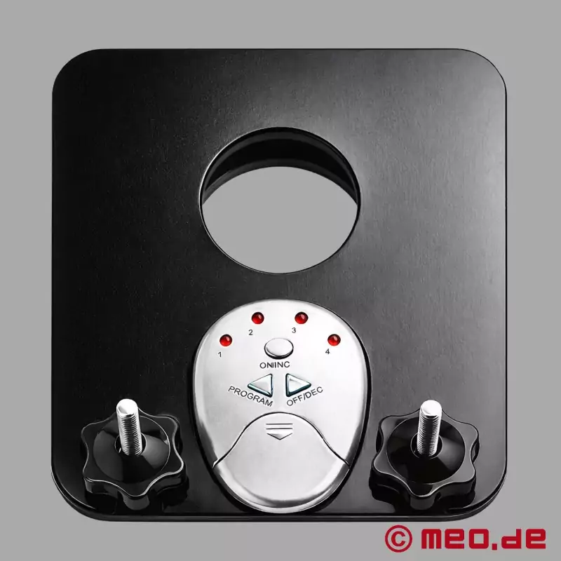 Пользоваться им очень просто: проведи полуэрегированный или неэрегированный пенис и его яички через круглое отверстие нашего устройства. В процессе закрытия протяни пенис через второе отверстие и закрой все встроенными винтами-барашками. Теперь ты можешь включить ток стимуляции с помощью прилагаемого устройства управления. Ты можешь выбирать между 10 различными уровнями интенсивности и 6 различными ритмами стимуляции, балуя или наказывая его.