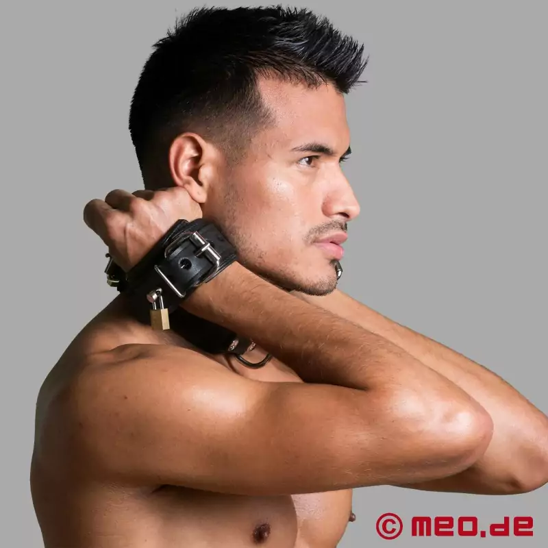 Halsband med handbojor: Bredd på bondage ca 55 mm. Fastnitad kombination av tre bondage. Både nackfästet och handbojorna kan låsas individuellt. Utrustad med tre likadana lås med nyckel. Halsbandet har även en kraftig D-ring. Utformad för smala till starka handleder.