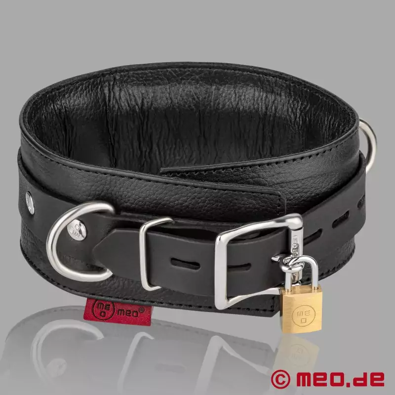 Den extra bredden gör att bondagehalsbandet ser ännu mer imponerande ut och snävar in nacken ännu mer om så önskas. Detta leder till en mer intensiv känsla av underkastelse under en BDSM-session, vilket är en mycket upphetsande upplevelse för många BDSM-fans. Speciellt när halsbandet är låst med ett hänglås! Bondagehalsbandet är mycket väl vadderat och justerbart i halsomkretsen så att det passar perfekt och är obevekligt hårt när det behövs. Den täta passformen i kombination med hög bärkomfort gör att vårt halsband även kan bäras under vanliga vardagskläder (t.ex. en polotröja) under dagen.
