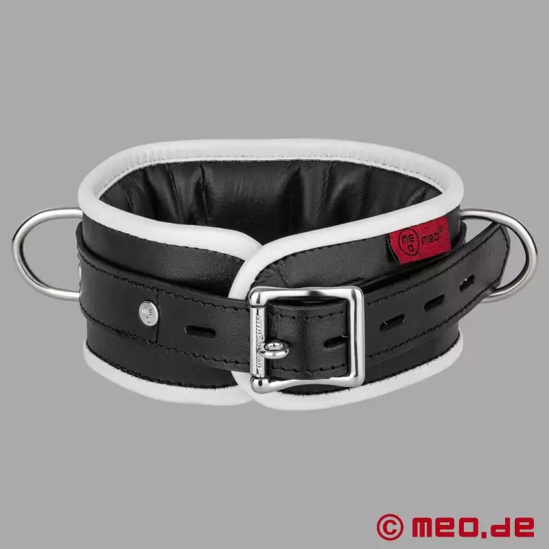 BDSM-kragen i svart/vitt läder imponerar med sin klassiska elegans och subtila färgdesign. Sub:en får en hög komfort, även om BDSM-halsbandet måste bäras under en längre tid. Vårt BDSM-halsband är utrustat med 3 ringar, som tydligt visar att subjektet tillhör älskarinnan eller mästaren, precis som i berättelsen om O.
