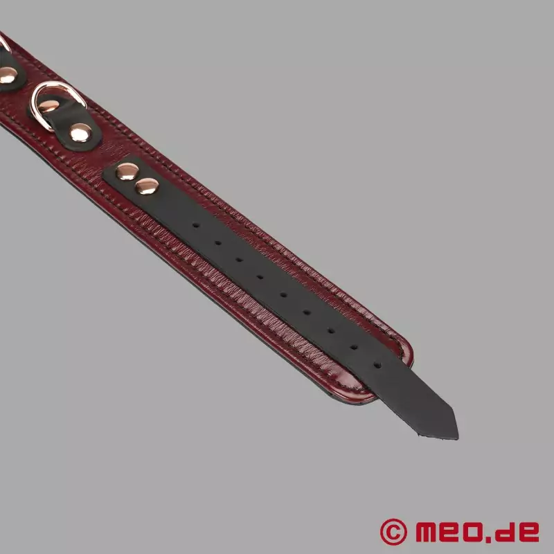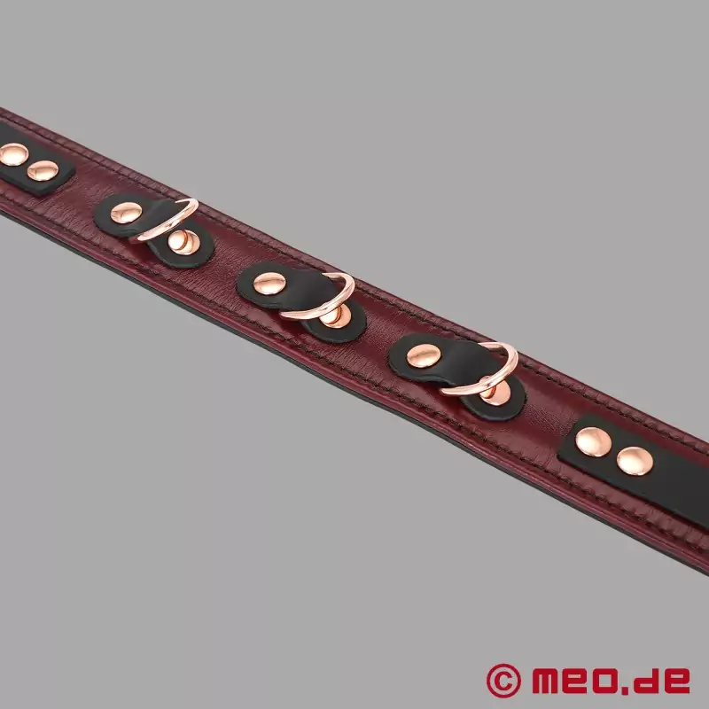 Med sin uttrycksfulla färg, en djup bordeauxröd, symboliserar den här kollektionen från MEO® inte bara elegans, kärlek, passion, romantik och värme; den är också avsedd att betona det känslomässiga bandet mellan Top och Sub under bondage. De roséguldfärgade metallelementen, som passar perfekt till designen, ger produkterna en härlig kontrast.