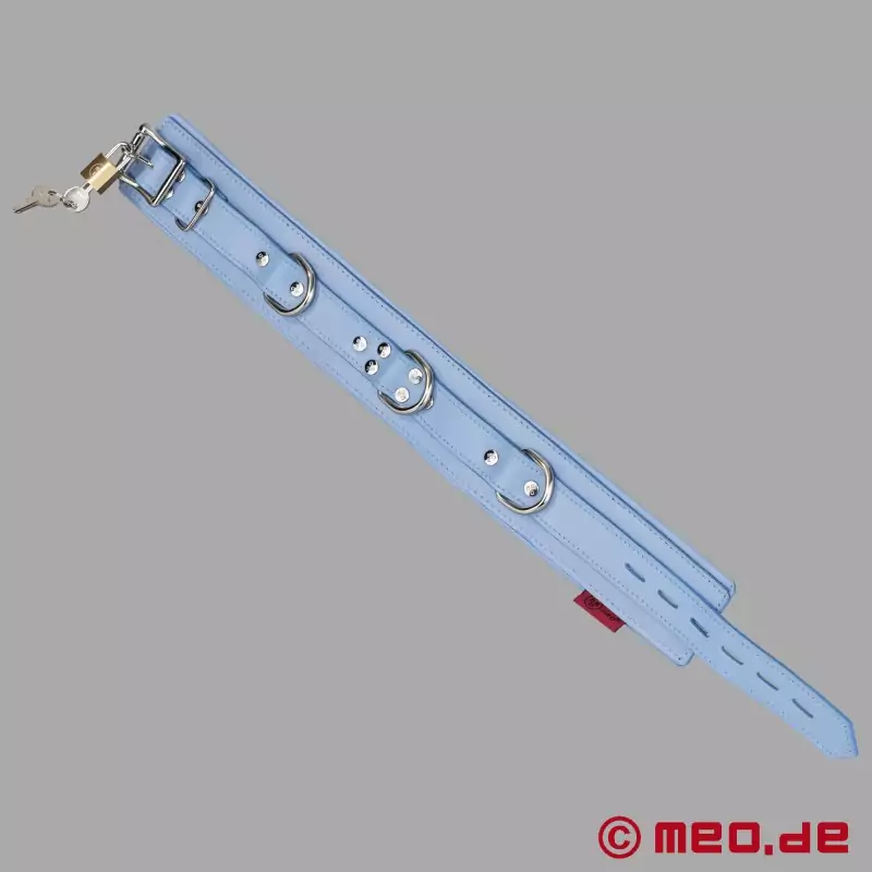 Det låsbara bondagehalsbandet omdefinierar bondage: azurblått premiumläder istället för klassiskt svart gör ett tydligt uttalande för elegant underkastelse och självsäker dominans. Det är perfekt för alla som vill visa upp sin passion på ett synligt och estetiskt tilltalande sätt.