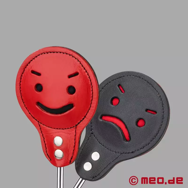 Paddeln från HURTME-serien erbjuder en unik och mångsidig spanking-upplevelse som imponerar med sin dubbelsidiga design: ena sidan av slagytan är i elegant svart och visar en mycket ond emoji, medan den andra sidan är i slående rött och visar en ondskefullt leende emoji. Den här kreativa designen gör det möjligt att visuellt uttrycka och variera stämningen och intensiteten i spelet genom att helt enkelt byta sida när man slår. Med sin robusta konstruktion, greppvänliga aluminiumhandtag och högkvalitativa läderöverdrag kombinerar den här paddeln stil, uttrycksfullhet och effektivitet för en BDSM-upplevelse i flera lager.