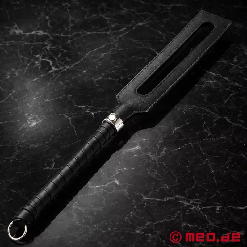 Vår BDSM paddle i läder är extremt slitstark, av högsta kvalitet och långlivad - även vid intensiv användning. Den rektangulära urtagningen i BDSM paddelns slagyta minskar luftmotståndet och ger på så sätt - slag för slag - smärtsamma resultat vid spanking. Detta innebär att en intensiv effekt kan uppnås med liten ansträngning.