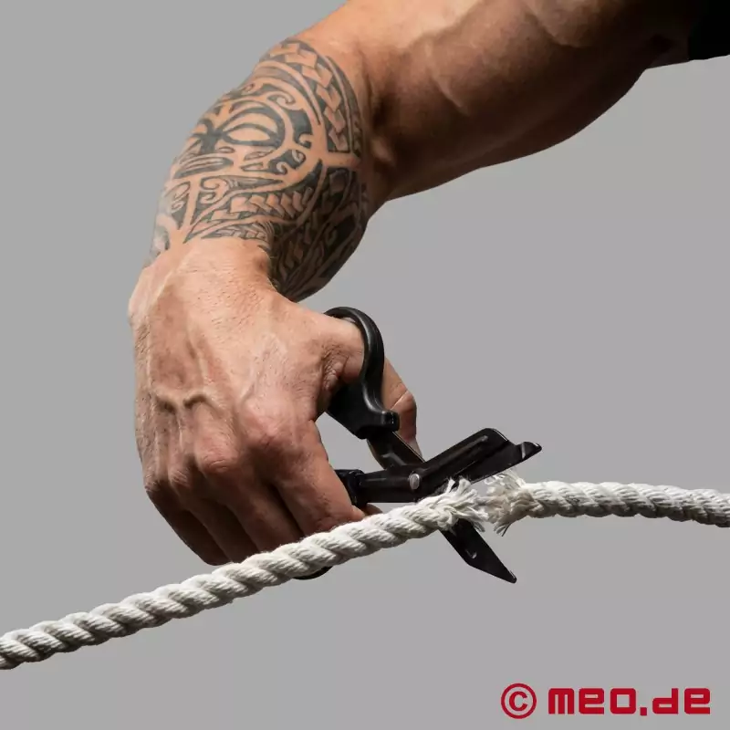 Denna ca 19 cm långa sax bör alltid finnas till hands så att den snabbt kan användas i en nödsituation. Denna specialutvecklade säkerhetssax, som liknar en bandagesax, är idealisk för att klippa igenom bondagerep av bomull och hampa eller bondagetejp av PVC.