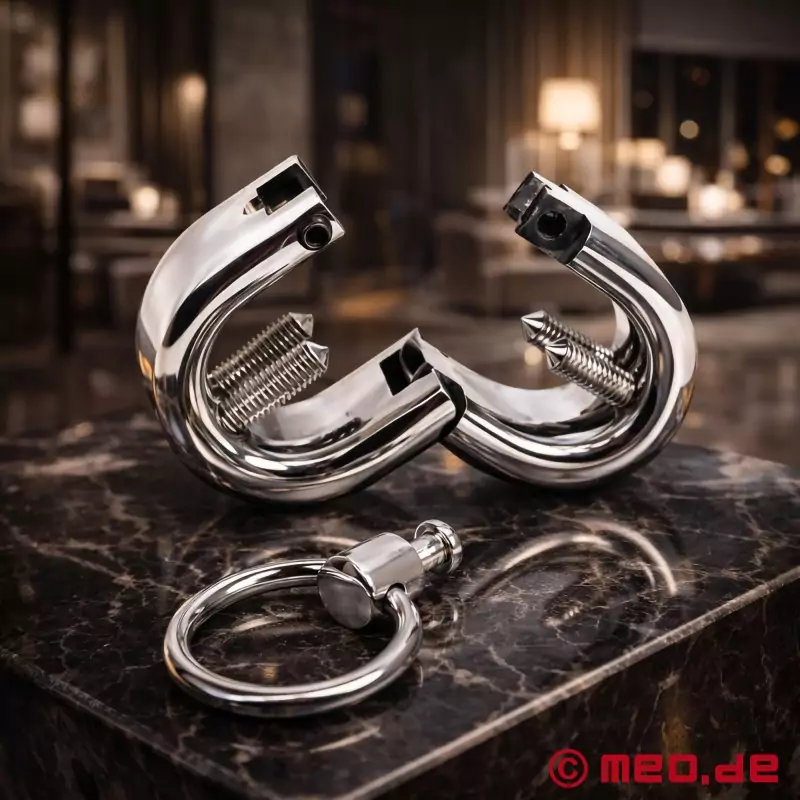 Ibland räcker det inte med ett kommando - då behöver du mer. IRONBITE™ ball stretcher med spikar och O-ring från MEO® är det perfekta BDSM-tillbehöret när disciplin inte är förhandlingsbart. Öppna ball stretcher med den medföljande insexnyckeln och stäng den igen. Skruva nu i sidoskruvarna - trycket från de vassa spetsarna ökar millimeter för millimeter. Den integrerade O-ringen gör det möjligt att fästa ytterligare vikter, linor eller kedjor - för ännu mer kontroll och ännu mer lydnad.
