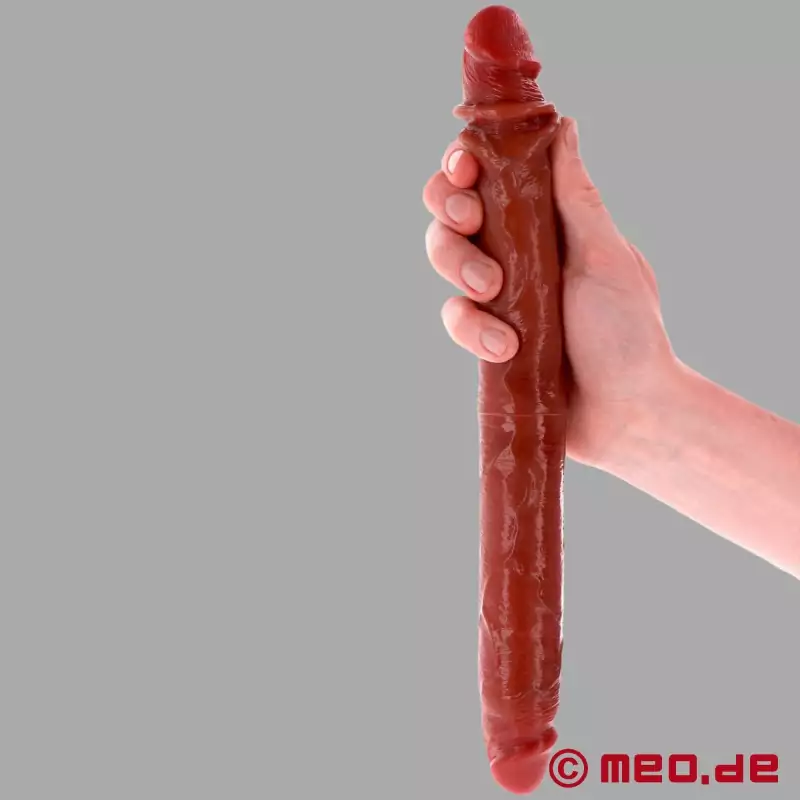 Den ser ut och känns som den äkta varan. Denna 35 cm långa och 3,5 cm tjocka dubbeldildo i hudliknande silikon har en rörlig förhud.