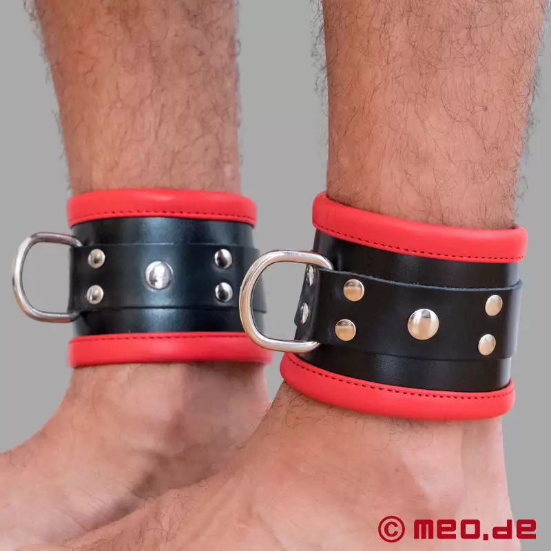 De ca 8 cm breda fotbojorna är tillverkade av det bästa kalvskinnet och sitter tätt runt anklarna: alla försök att fly är därför meningslösa! Våra fotbojor kan fästas med var sitt metallspänne. En D-ring är också fäst på varje fotboja så att båda fotbojorna kan anslutas med en kedja, en spridarstång eller den medföljande anslutande dubbla karbinhaken.