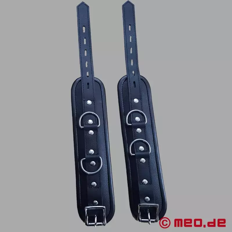 Bondage fotbojor passar bekvämt men tätt runt anklarna. Dessa fotbojor kan fästas och justeras i storlek med ett metallspänne. Två ringar är fästa på våra BDSM fotbojor så att båda fotbojorna kan anslutas med en kedja, ett rep eller med våra anslutande dubbla karbinhakar. Naturligtvis kan dessa ringar också användas för att fästa en spridarstång. Du hittar lämpliga spridarstänger här i MEO ® bondage shop.