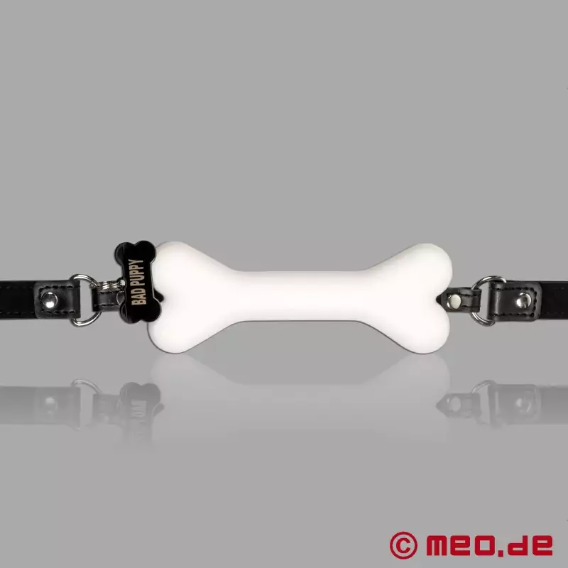 Uppkäftiga valpar, men även oregerliga alfahannar, behöver tuktas! Och helst i form av vår vita munkavle med hundben , Bästsäljaren för Human Puppy.