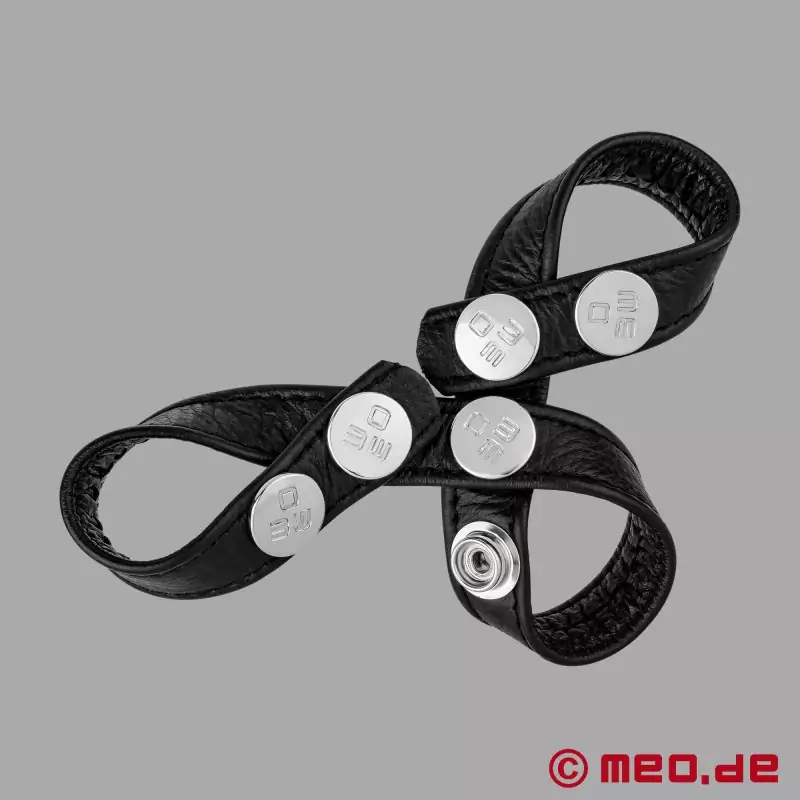 Det högkvalitativa lädret sitter tätt runt penis och testiklar, medan tryckknapparna i rostfritt stål möjliggör flexibel anpassning till din anatomi. Oavsett om det är som en del av din fetischoutfit eller för en extra dos kraft under sex - den här dubbla cockringen är det perfekta valet!
