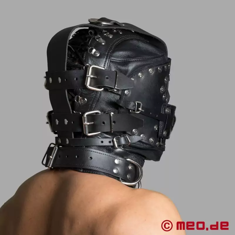 En bred, låsbar krage med två stora D-ringar förvandlar masken till en slags huvudbur. Tre längsgående och tvärgående huvudremmar med spännen möjliggör exakt justering, vilket skapar den ultimata känslan av huvudbondage.