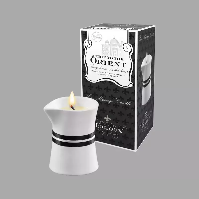 Massageljuset Petits Joujoux Orient tar dig med till Orientens mystiska värld, där sensualitet och exotism möts. Den förföriska doften av granatäpple och vitpeppar breder ut sig när ljuset tänds och skapar en mystisk, lyxig atmosfär som berör alla sinnen. Den varma oljan som bildas när det orientaliska massageljuset smälter är rik på vårdande ingredienser som gör huden mjuk och smidig. Massageljuset är perfekt för den som söker något speciellt och vill förtrollas av exotiska dofter.