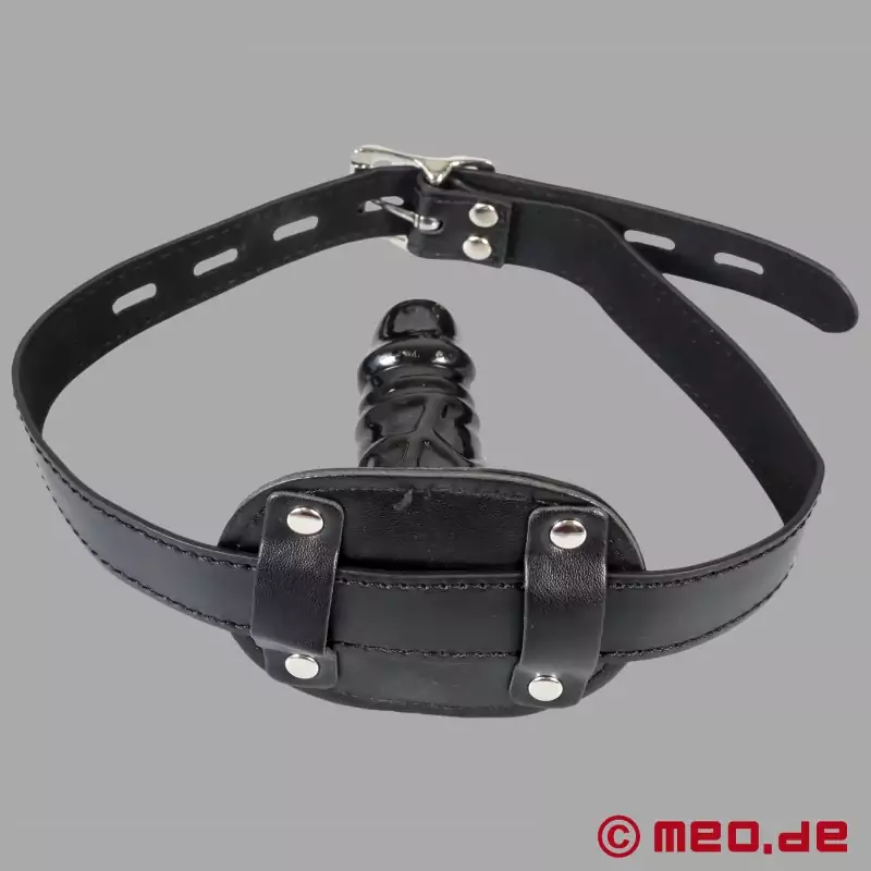 MEO®:s penis gag stänger munnen med ett brett läderband som fästs bak i nacken. På insidan sticker en realistisk kopia av en utbuktande penis djupt in i munnen.