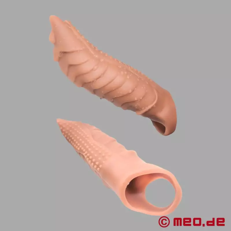 Den elastiska silikonhylsan anpassar sig perfekt till alla penisar, förstorar den märkbart och skapar ett imponerande, monstruöst utseende. Den distinkta ytstrukturen med spår, nubbar och lameller ger intensiv stimulering vid varje stötar in i anus eller vagina. Insidan av penishylsan är mjuk och smidig för maximal komfort, medan utsidan är dominant, vild och kompromisslös.