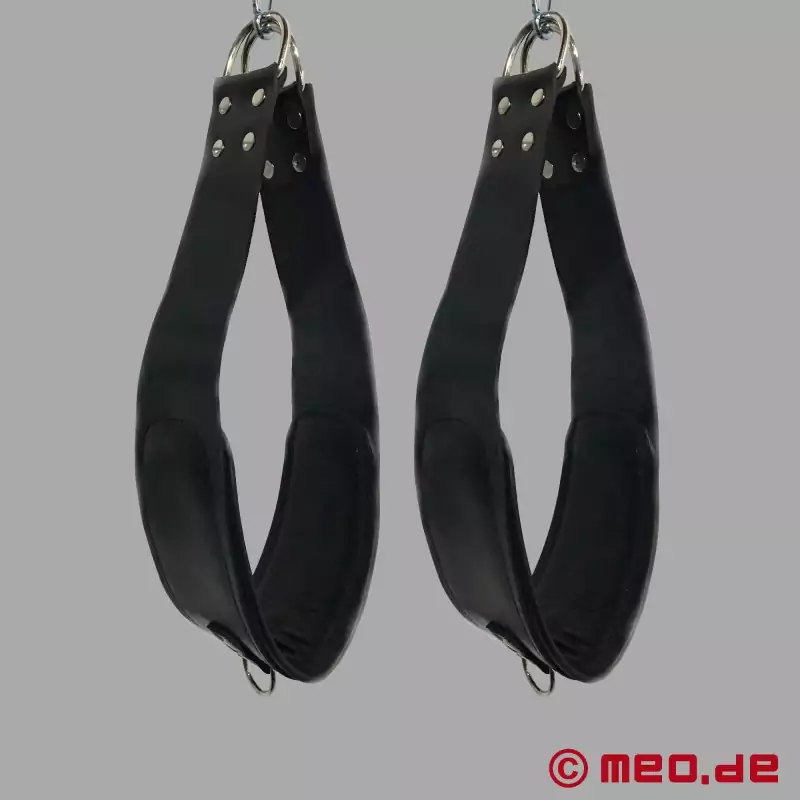 Särskilt lämpliga för övningar som fist fucking eller riktigt hårt sex! Våra vadderade fotremmar i läder är det mest populära tillbehöret till en sling. Dessa fotremmar är tillverkade av kohudläder, noggrant vadderade och extremt robusta. De är perfekta för våra läderslingor, slingmattor och slingbrädor. Fotbanden är nitade 4 gånger per D-ring och tål höga belastningar. Integrerade D-ringar gör att du kan fästa benöglorna i fästkedjorna på en sling med hjälp av de medföljande karbinhakarna.