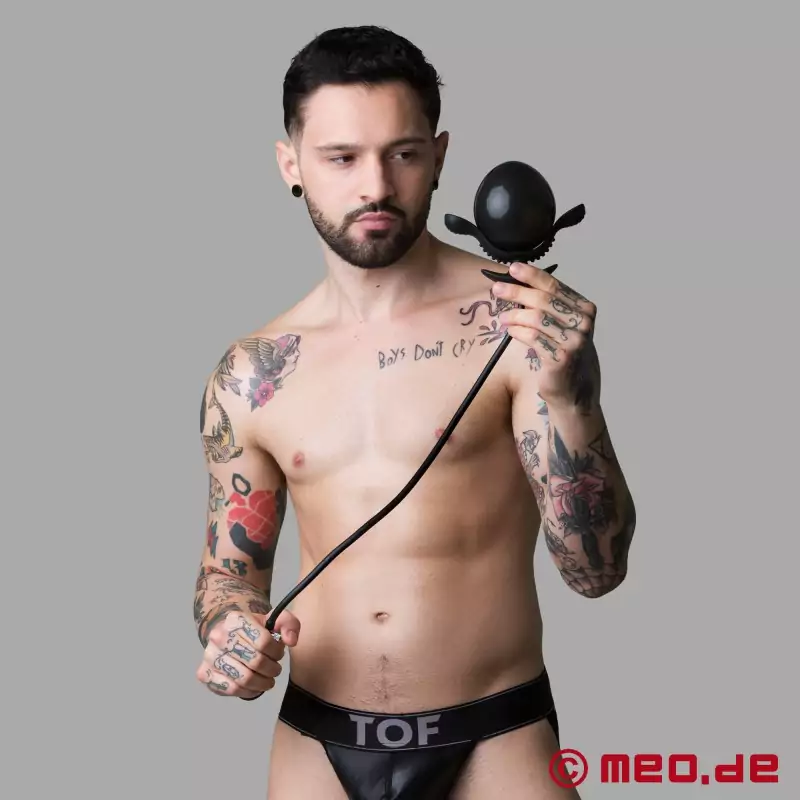 Möjligheten att blåsa upp buttpluggen upp till 80 mm och därmed uppleva en anpassningsbar känsla är helt enkelt underbar. Designen och specialfunktionerna gör buttpluggen särskilt tilltalande, eftersom den anpassar sig perfekt till kroppens inre konturer och därför ger mycket intensiv men behaglig stimulering. Det integrerade 500 mm långa röret med pumpkula möjliggör exakt kontroll av uppblåsningsgraden så att användaren kan ändra storleken efter önskemål.