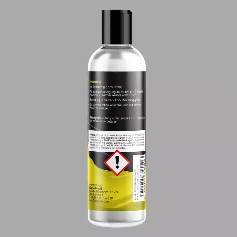 Seksi ıslak görünümlü giysiler özel temizlik gerektirir. beGLOSS® Special Wash™ bunun için mükemmel olan özel bir temizlik maddesidir. Kiri ve hoş olmayan kokuları nazikçe, hızlı ve etkili bir şekilde giderir ve ıslak görünümlü giysi ve aksesuarların bakımını destekler. Ayrıca malzemenin esnekliğini korumaya ve çatlamasını önlemeye yardımcı olur. Almanya'da üretilmiştir.