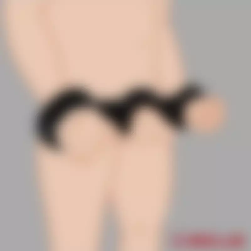 Boyunduruk, pasif erkeğin her iki elini (sol ve sağ el) cinsel organlarına (ortada) bağlar ve böylece onu kesinlikle hareket edemez hale getirir.