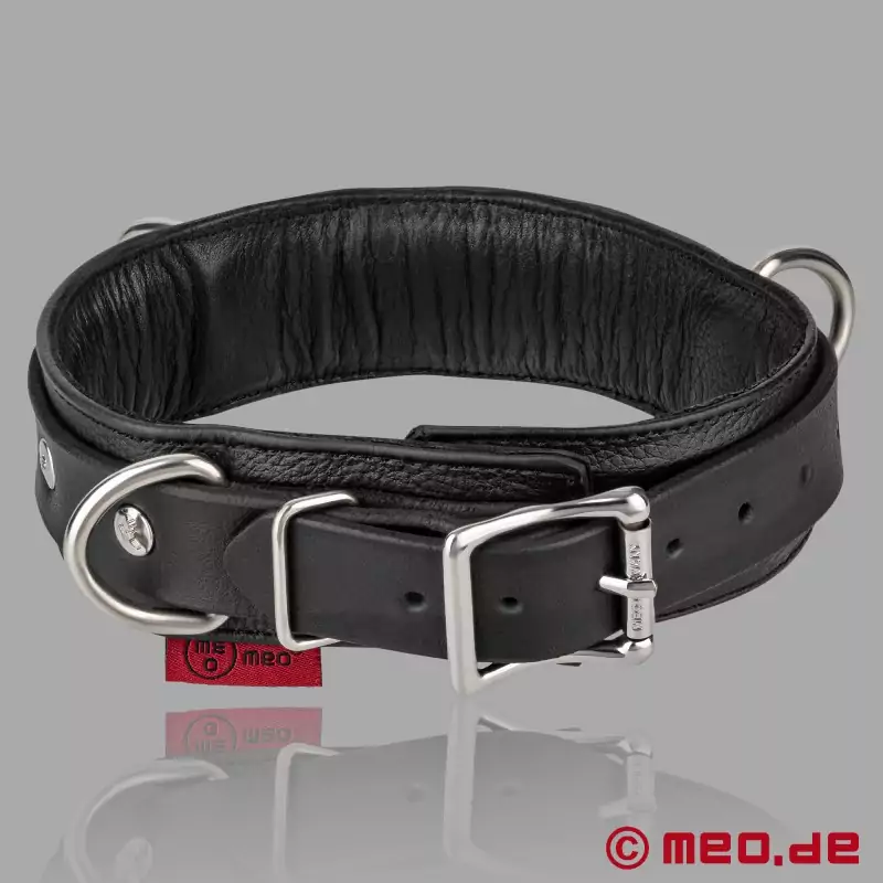 Yaka yumuşak, dolgulu deriden yapılmıştır ve rahatça giyilebilecek şekilde tasarlanmıştır. Çoklu dikişler şeklini korumasına yardımcı olurken, dolgulu yüzey rahat bir oturuş sağlar. Metal halkalar net, baskın bir vurgu sağlar ve uyumlu esaret aksesuarlarını (örneğin tasma, çelik zincirler veya esaret ipi) takma seçeneği sunar.