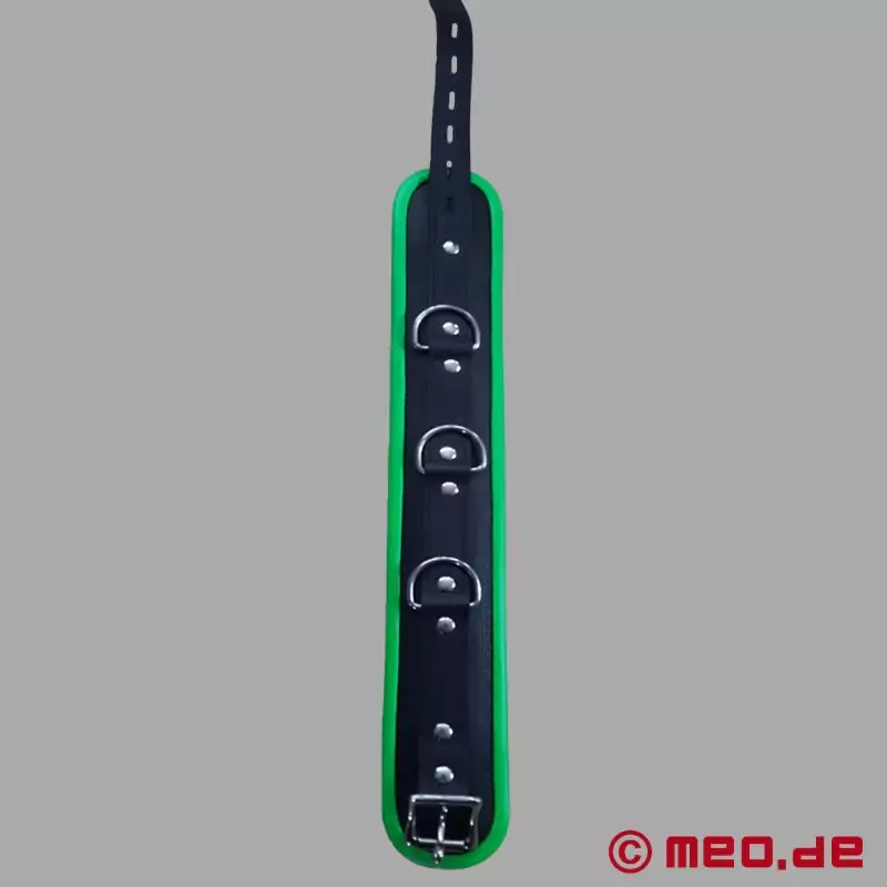 BDSM tasması, esaret sırasında yüksek düzeyde konfor için özellikle ayrıntılı bir yüzeye ve dikkatlice yuvarlatılmış kenarlara sahiptir . Takılı üç halka, zincir veya tasma takmanıza olanak tanır, böylece köleniz tasma ile sizi her zaman istediğiniz yönde takip eder.