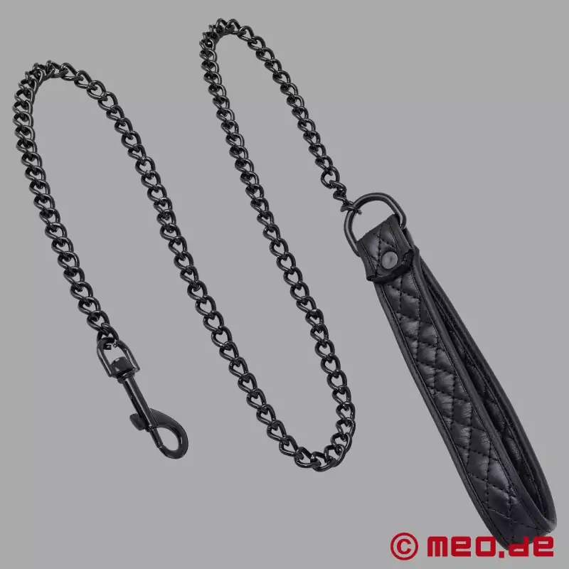 Elmas dikişli yastıklı deri halka, siyah kaplamalı metal zincir ve esaret tasmasının D halkasına hızlı bağlantı için bir karabinadan oluşan bir BDSM tasma. Perçinler siyah kaplamalıdır ve perçin üzerinde MEO® markası da bulunmaktadır. Deri için bakım talimatları ve kadife bir saklama çantası da dahildir.
