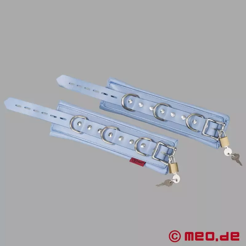 Bu masmavi el kelepçelerine ek olarak, MEO® Malibu koleksiyonu renk uyumlu ayak kelepçeleri ve şık bir esaret yakası da sunmaktadır. Tüm ürünler kilitlenebilir ve tek tek veya set olarak mevcuttur. Her ürün aynı şekilde kilitlenen iki asma kilit, dört anahtar ve ayrıntılı bakım talimatları ile birlikte verilir. El kelepçeleri MEOBOND™ dijital zaman kilidiyle de uyumludur - kendi kendine bağlama için idealdir.
