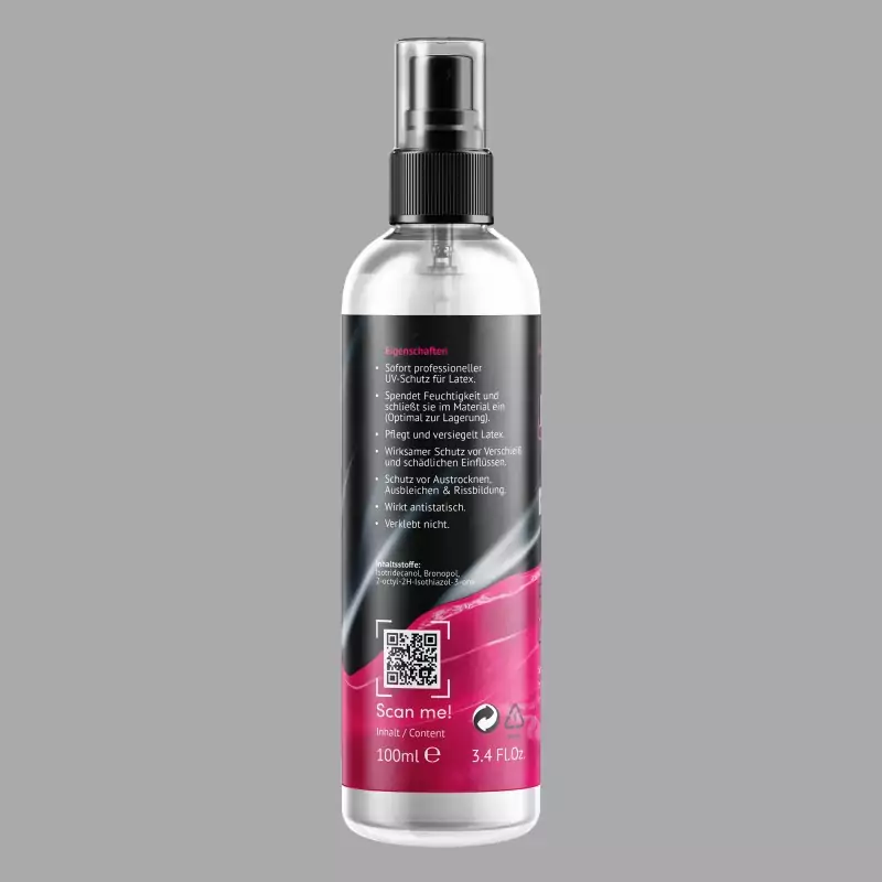 beGLOSS® Perfect Shine™ lateks giysiler için ipeksi mat bir yüzey sağlayan UV ve depolama korumalı bir cila spreyidir. Özel formülü lateks yüzeyi nemlendirir, sızdırmaz hale getirir ve lateksin depolama sırasında - özellikle yüksek sıcaklıklarda - kurumasını önlemeye yardımcı olur. Almanya'da üretilmiştir.