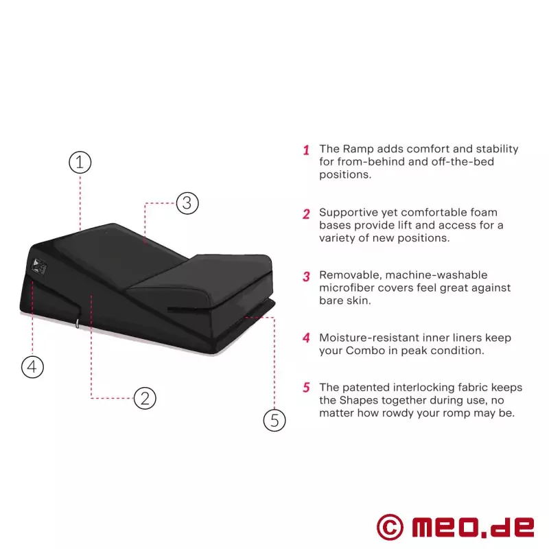 Şık "Wedge Ramp Combo" daha fazla konfor, daha derin penetrasyon ve daha yoğun orgazm sağlar. Set, farklı boyutlarda iki ergonomik şekilli kama yastıktan oluşur. Özel V şekilleri sayesinde pelvis ve kalçalar yükseltilir, vücut mükemmel pozisyona getirilir ve vajinal, anal veya oral, örneğin deepthroat sırasında önemli ölçüde daha derin ve daha yoğun penetrasyon mümkündür. Mikrofiber kaplı, ipeksi yumuşaklıktaki kılıflarıyla iki yastık kaymadan birbirine yapışır ve istenildiği gibi birleştirilebilir. Küçük yastık ("Wedge") büyük olanın ("Ramp") üzerine ayrı ayrı yerleştirilebilir, böylece sayısız pozisyon ve varyasyon mümkündür. Elbette, her iki minder de her durumda maksimum esneklik için ayrı ayrı da kullanılabilir.
