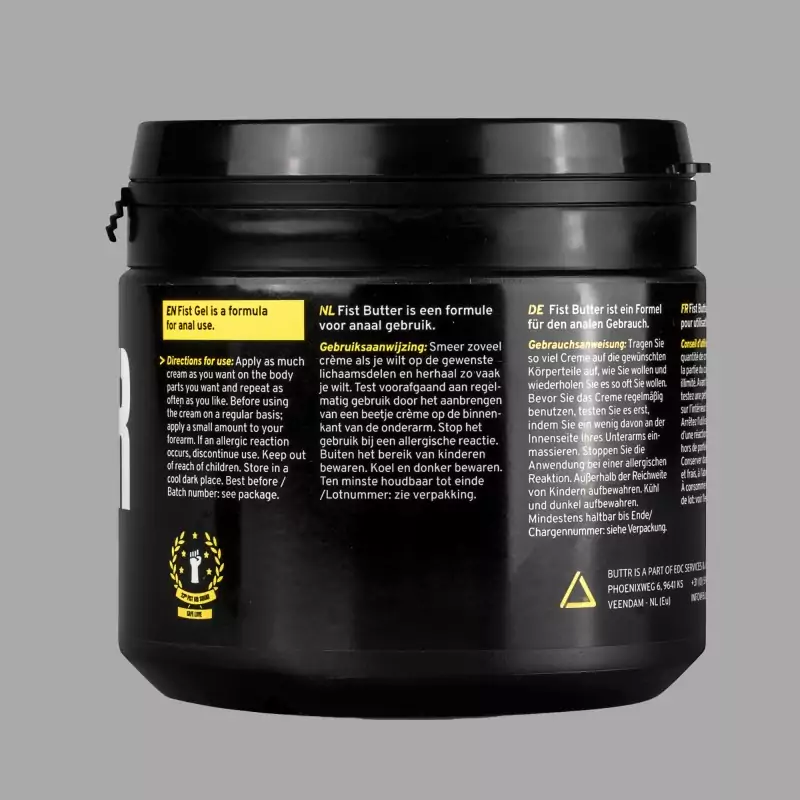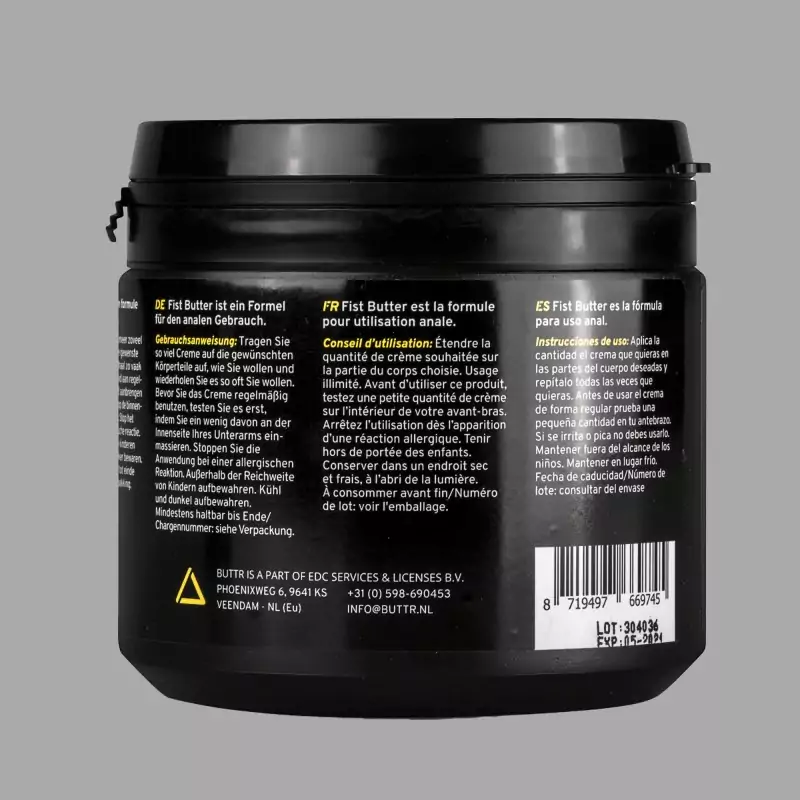 BUTTR Fisting Butter, fisting hayranları için vazgeçilmezdir. Fisting Butter, penetrasyonu kolaylaştıran son derece pürüzsüz, viskoz bir anal yağlayıcıdır. Fisting Butter, onu harika bir şekilde kaygan hale getiren yüksek kaliteli Vazelin içerir. Eşsiz kompozisyon, anal veya vajinal fisting sırasında uzun süreli zevk sağlar. Cilde karşı naziktir, uzun süre esnek ve kaygan kalır ve yapay kokular içermez. Büyük 500 ml'lik kavanoz, cinsel ilişki sırasında kayganlaştırıcıyı uygulamayı kolaylaştırır, böylece tamamen zevkinize konsantre olabilirsiniz.